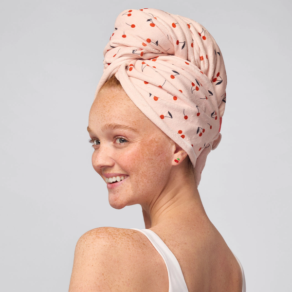 * Cuts down drying time with moisture-absorbing microfiber * Gentle, friction-free material helps tame frizz and reduce breakage * Stylish cherry print design adds a touch of glam to your post-shower me time Why You'll Love This: * Stays tucked in place with the snug elastic strap * Oversized design is suitable for most hair types, textures, and lengths * Reduces blow-drying time for less-damage and healthier hair