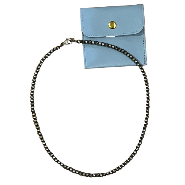 This necklace is handcrafted with authentic, oxidized sterling silver 4mm beads. It features 4mm Navajo Pearls in a length of 18". This necklace does not have an extender.